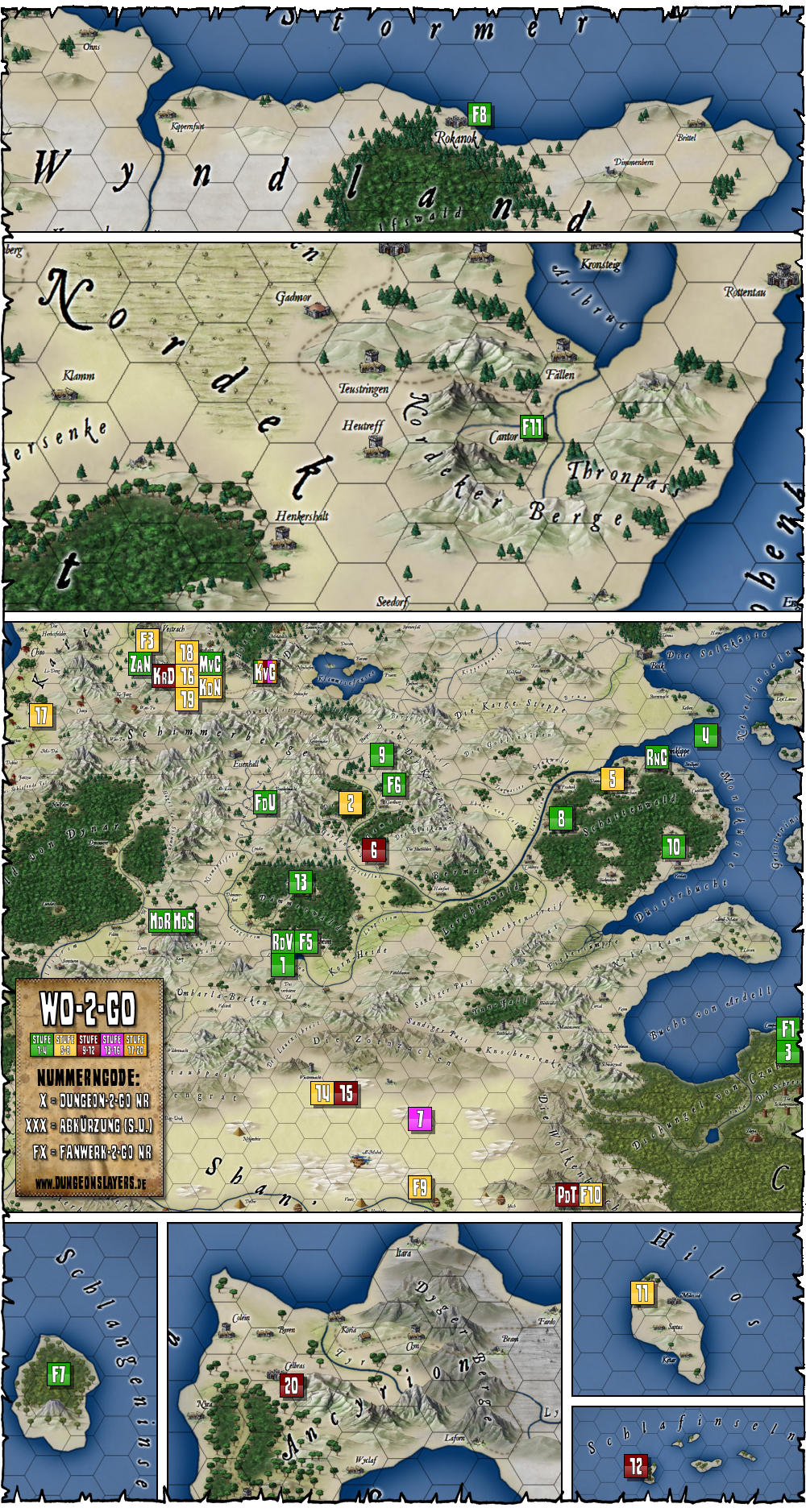 FdU: Festung des Unheils, HdR: Herr der Ratten, HdS: Höhle der Schatten, KdN: Katakomben des Nekromanten, KrD: Kult des roten Drachen, KvG: Kerker von Grimmstein, MvC: Minen von Crimlak, PdT: Pyramide des Todes, RdV: Reise des Verrats, RnC: Reise nach Crimlak, ZaN: Zantalus
